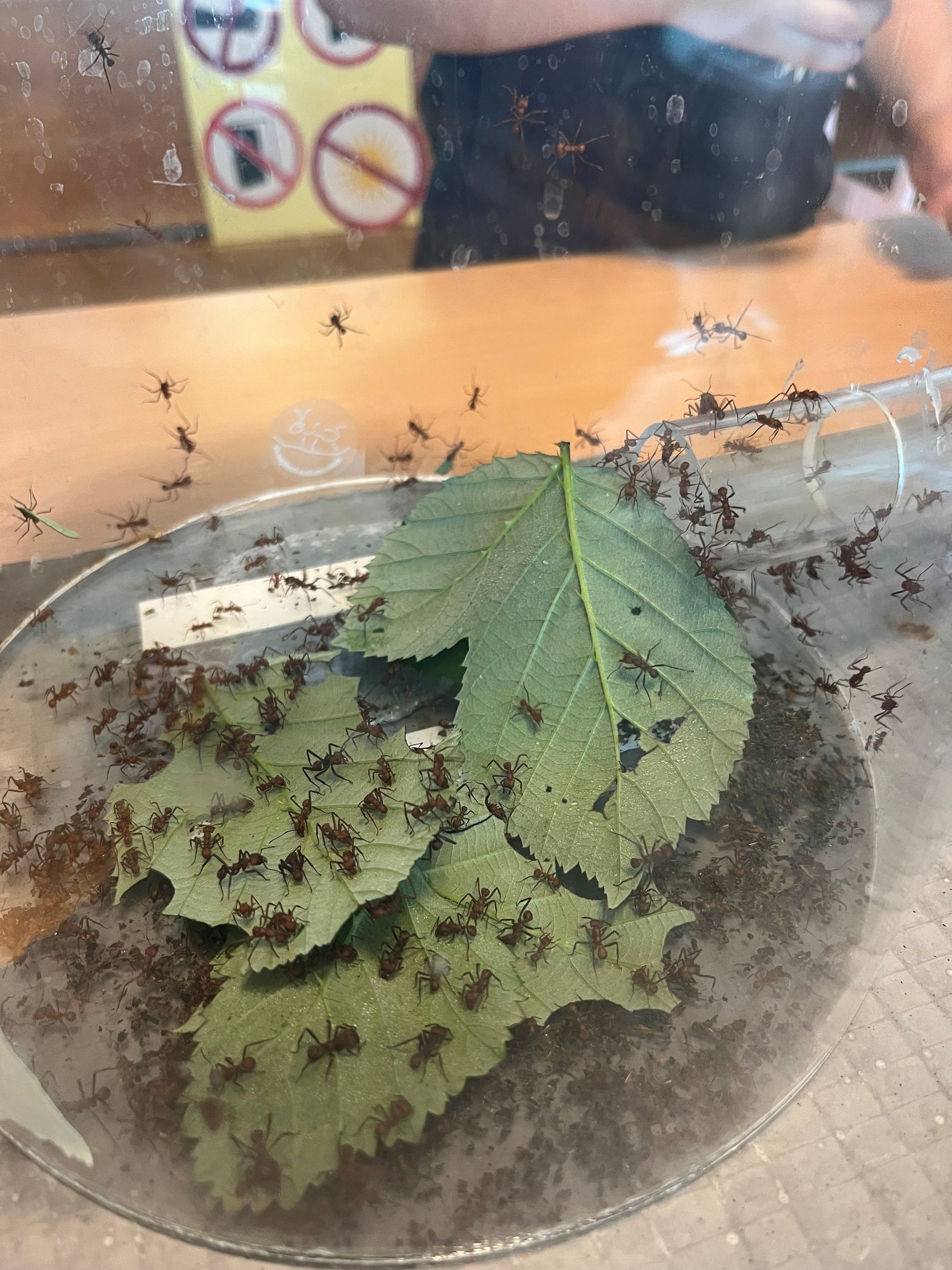 Die Blattschneiderameisen beeindruckten alle mit ihrer grossen Stärke – sie trugen riesige Blätterstücke, die fast grösser waren als sie selbst. Bei den Körnerameisen war sogar die Ameisenkönigin zu sehen, was die Kinder besonders faszinierte.