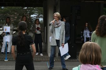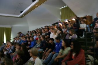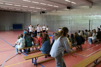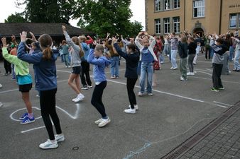 Die Blache mit dem Motto wurde an der Eröffnungsfeier des Schuljahres freudig entrollt. Im Verlauf des Schuljahres wird die Mittelstufe verschiedene Aktivitäten passend zum Motto durchführen, vom gemeinsamen Singen bis hin zu einer Projektwoche. Ganz allgemein soll das Motto die Mittelstufe durch das Schuljahr begleiten und das Zusammengehörigkeitsgefühl und den Respekt untereinander fördern. Einiges dazu ist bereits gegen Ende des letzten Schuljahres entstanden, so z.B. die Pausenplatzregeln, die gemeinsam mit allen Klassen erstellt wurden.