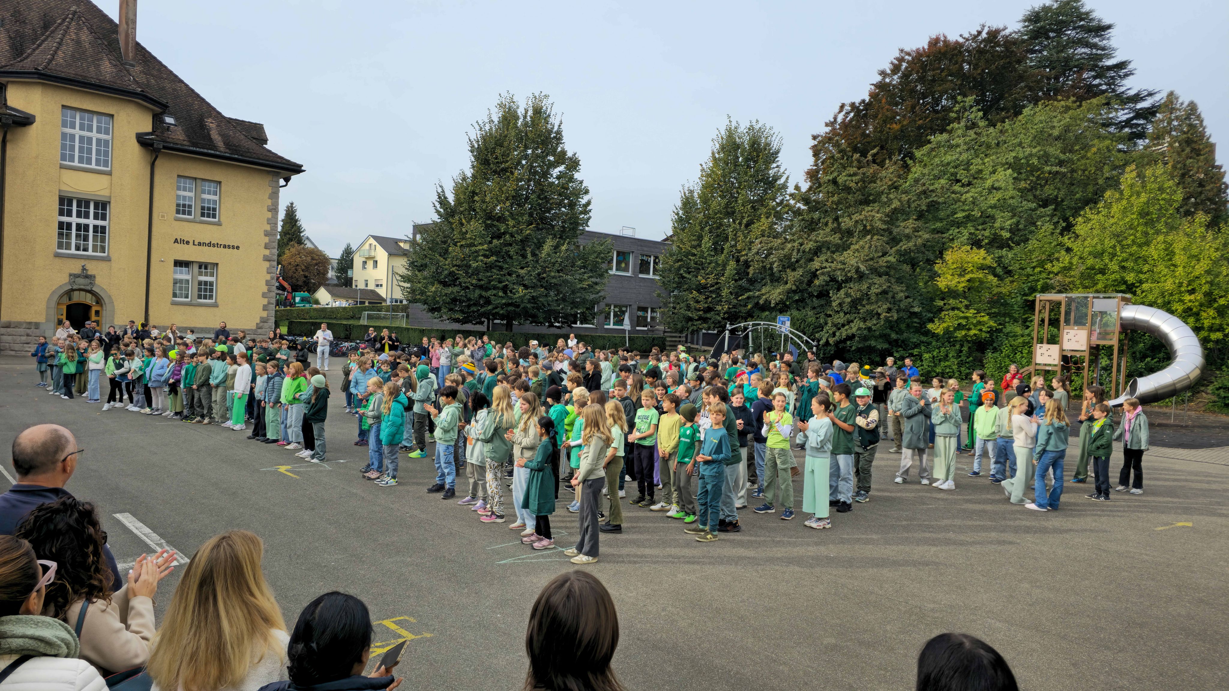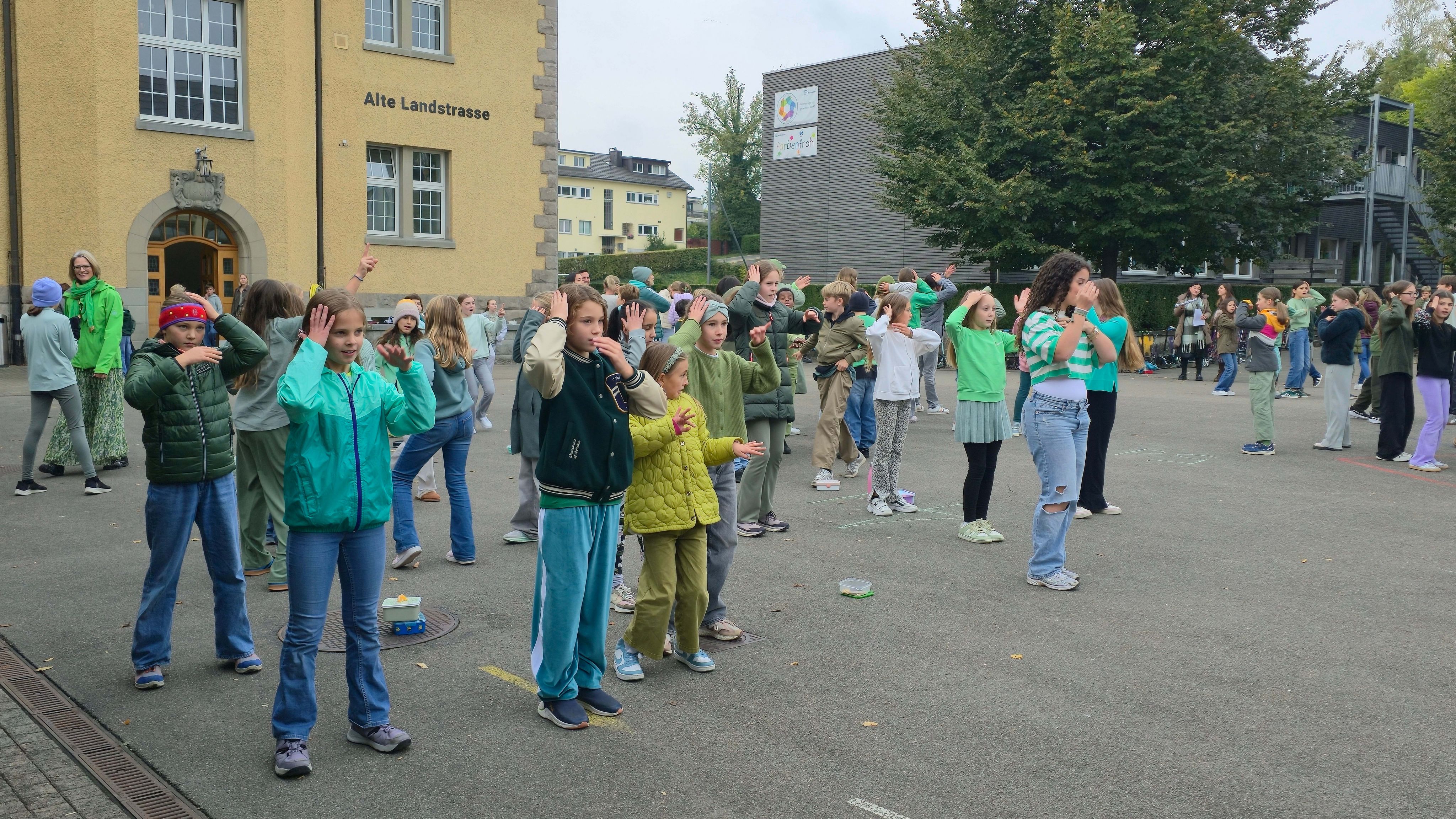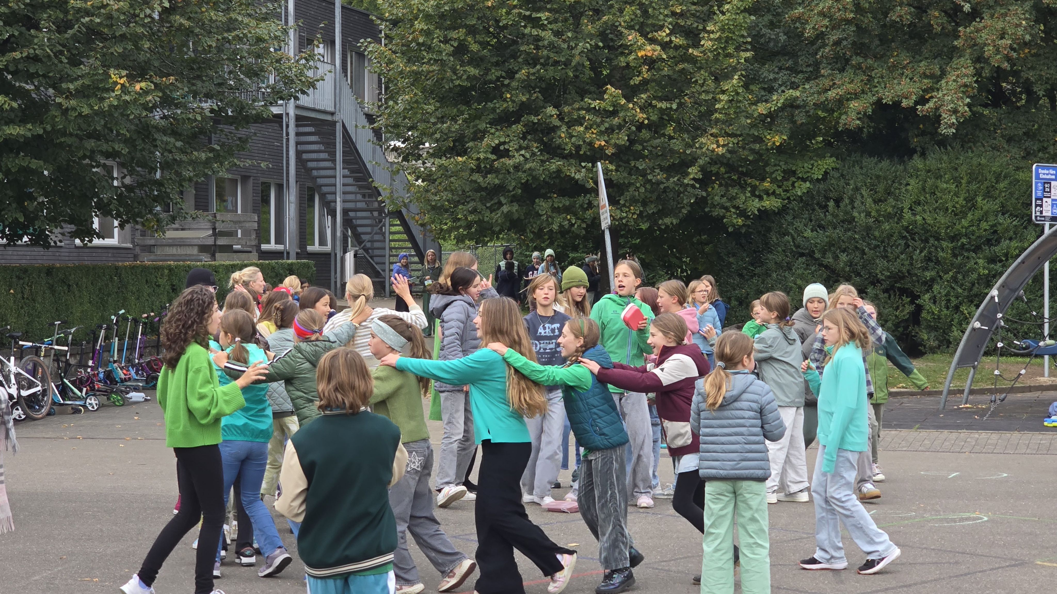 Die Blache mit dem Motto wurde an der Eröffnungsfeier des Schuljahres freudig entrollt. Im Verlauf des Schuljahres wird die Mittelstufe verschiedene Aktivitäten passend zum Motto durchführen, vom gemeinsamen Singen bis hin zu einer Projektwoche. Ganz allgemein soll das Motto die Mittelstufe durch das Schuljahr begleiten und das Zusammengehörigkeitsgefühl und den Respekt untereinander fördern. Einiges dazu ist bereits gegen Ende des letzten Schuljahres entstanden, so z.B. die Pausenplatzregeln, die gemeinsam mit allen Klassen erstellt wurden.